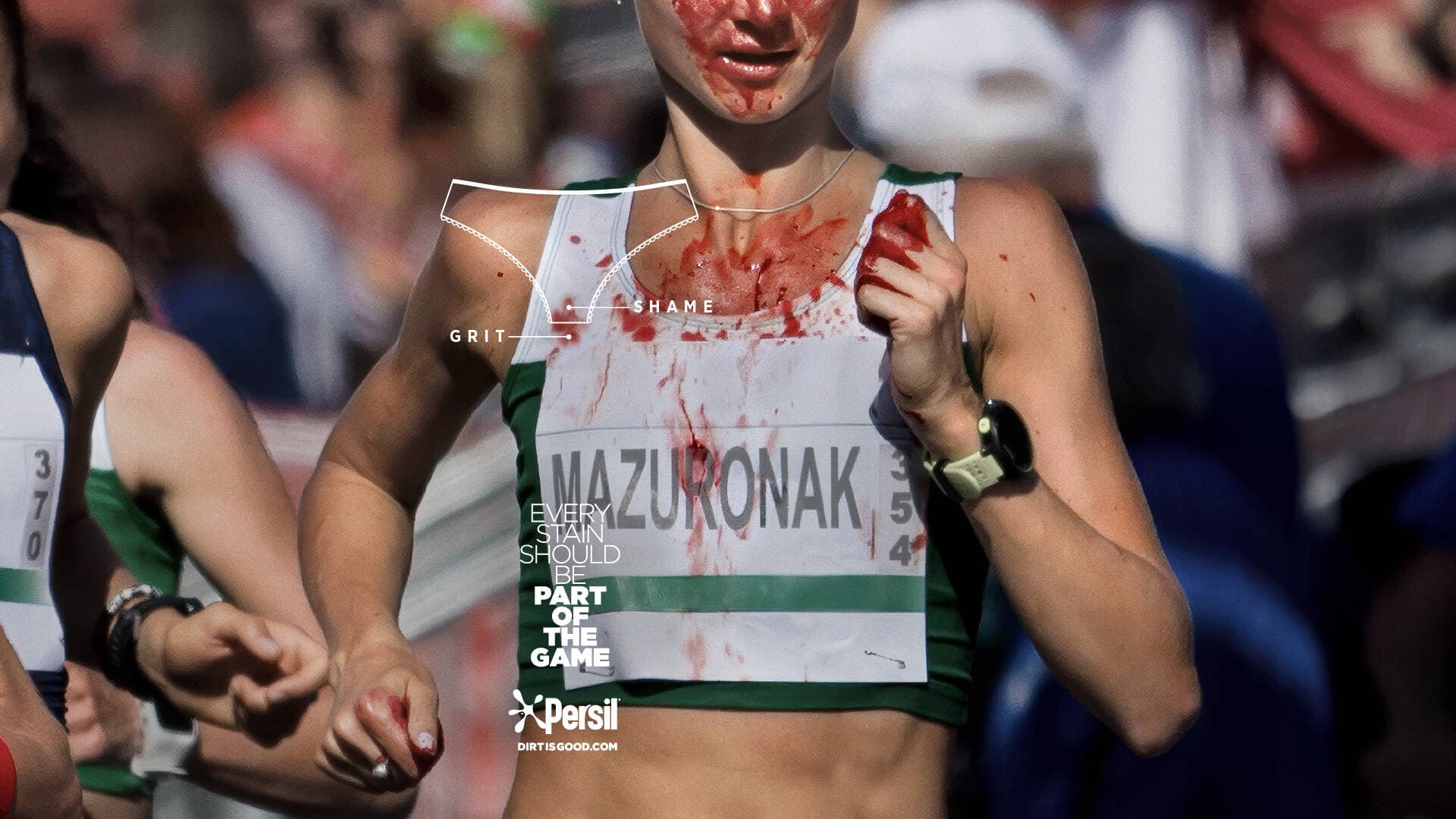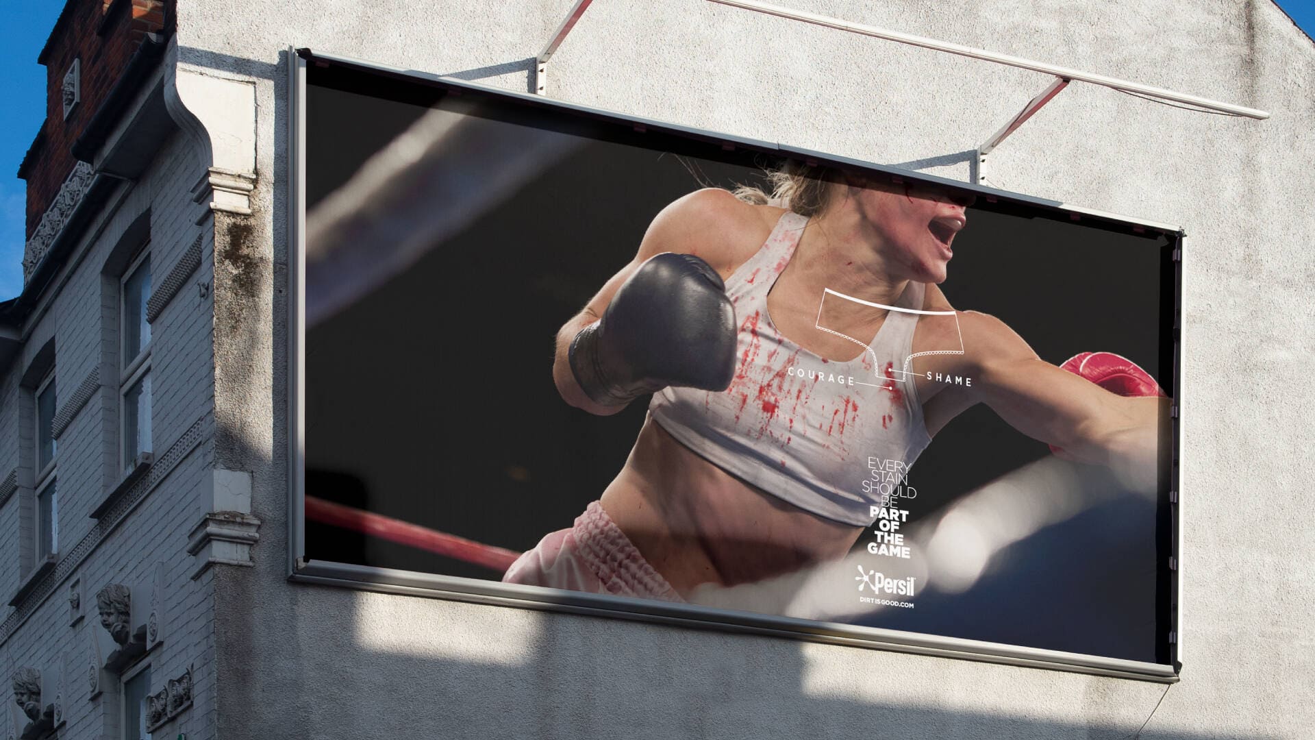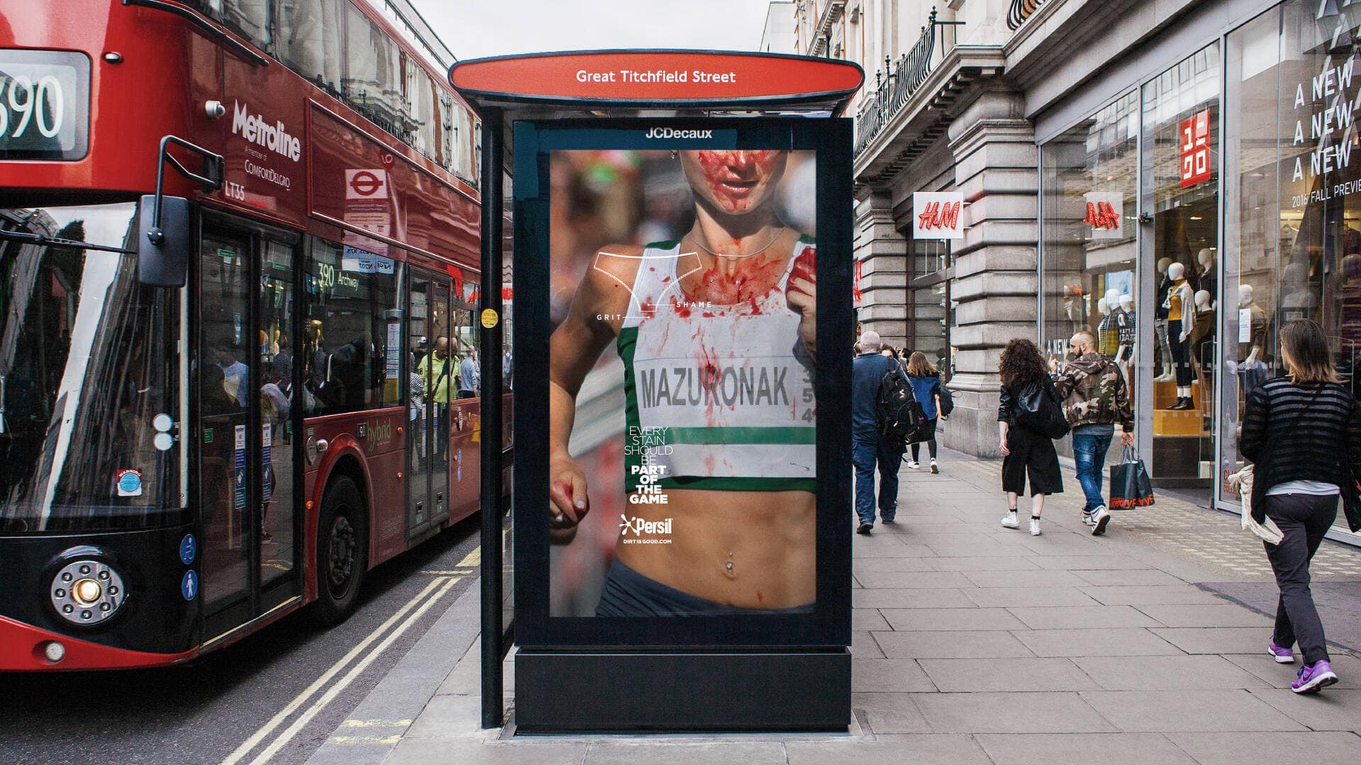 The out-of-home element of the campaign consists of real images of female athletes who have bled during their performances, with the stains transformed into statements through juxtaposing blood-stained underwear and grass-stained shirts to question why they are viewed differently in sports.