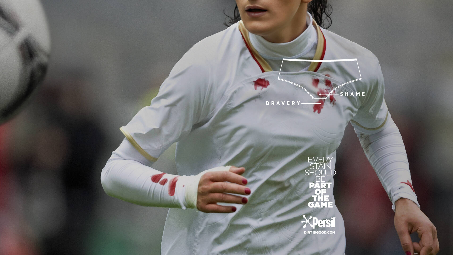 “Every stain should be part of the game”, created by MullenLowe, calls out the double standard in sports, where blood stains from injuries obtained while playing the game may become badges of honour, while period stains can be met with embarrassment. Its aim is to empower the next generation of girls to play sports without fear of stains.